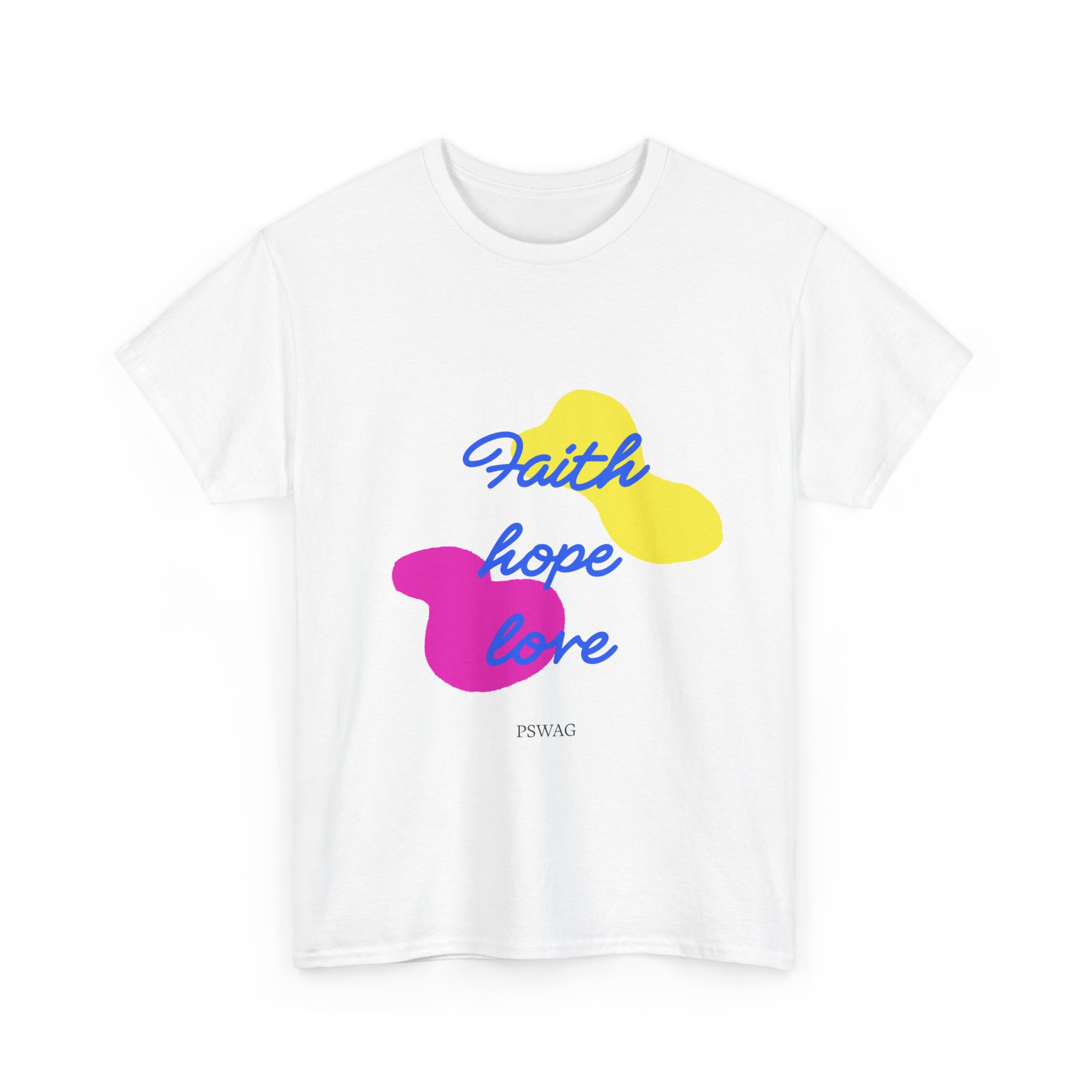 Soft, simple, and quietly uplifting — this classic cotton tee carries a gentle message: Faith, hope, love. The clean white canvas puts the airy blue script and soft organic shapes in sunshine yellow and bubblegum pink front and center.